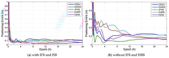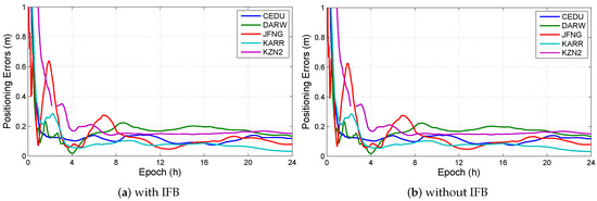 Positioning errors with or without IFB in UC3-BDS at different stations. (a) The positioning errors in UC3-BDS with IFB; (b) The positioning errors in UC3-BDS without IFB.