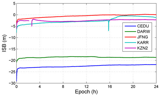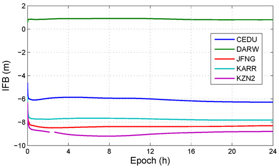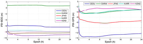 When IFB is regarded as variable, it can be estimated according to the references [11,14,15,16,17]. The root mean square (RMS) values of IFBs in GPS and BDS are less than 0.3 mm [18,32]. They are far less than the RMS value of noise in carrier phase (3 mm) [10]. We ignore time-variant component of IFB and regard IFB as a constant [19]. The satellite IFB needs to be corrected using the DCB files published by IGS organization, and the receiver IFB needs to be estimated together with other unknown parameters. Namely, the estimated IFB in the actual PPP is the receiver component of IFB.