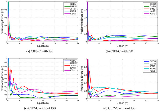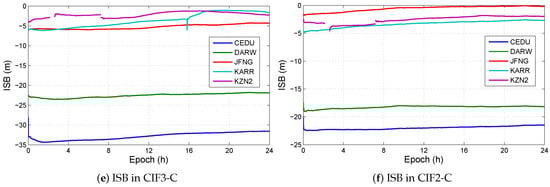 In all observation models with BDS/GPS, the models, which have ISB and do not have IFB, include conventional ionosphere-free model with triple-frequency BDS/GPS combination (CIF3-C) and conventional ionosphere-free model with dual-frequency BDS/GPS combination (CIF2-C). The positioning errors in CIF3-C and CIF2-C are shown in Figure 6. The results show that ignoring ISB can increase positioning errors in the decimeter range. ISB can not be omitted as a parameter to be solved. There is a parameter ISB between any two of systems. In this experiment, ISB is the difference between receiver clock errors in BDS and GPS. ISB is set to a random process like receiver clock error, so the variance of dynamic noise in ISB is the sum of the variances of dynamic noise in receiver clock errors from GPS and BDS. We presumed that the variances of dynamic noise in receiver clock errors from GPS and BDS are same. The variance of dynamic noise in ISB is twice than the variance of dynamic noise in receiver clock error. The initial value of ISB is arbitrary value, it is set to be one in this experiment.