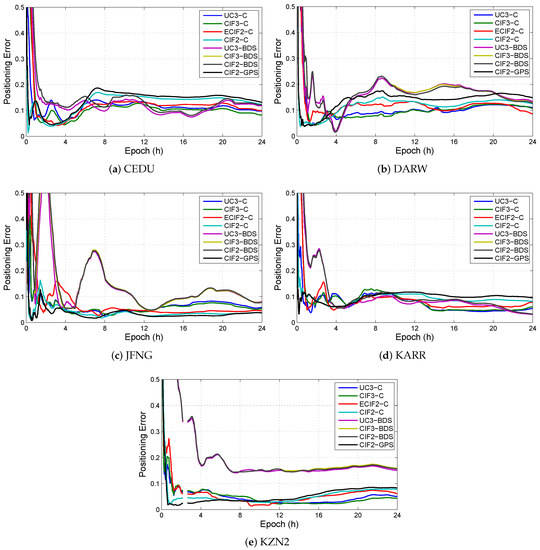 As shown in Figure 10, all eight models are used to compare positioning solution at different stations (CEDU, DARW, JFNG, KARR, KZN2). The results show that the positioning errors in different models are similar, except UC3-BDS and CIF3-BDS at KZN2. Because the number of visible BDS satellites at KZN2 is less than others stations in Figure 3.
