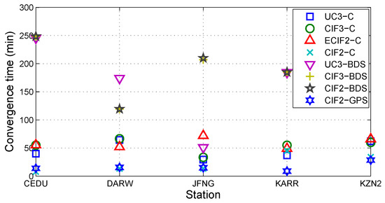 Table 7 shows the mean accuracy, mean precision, mean convergence time, and median convergence time for different combined models with the daily solution at different stations. The results show that CIF2-C needs more mean convergence time than CIF2-GPS. It is inconsistent with the usual result “CIF2-C usually needs less convergence time than CIF2-GPS”. In Figure 11, CIF2-C needs more mean convergence time than CIF2-GPS only occurs at KARR. Mean convergence time can not reflect convergence characteristics of different models. Median convergence time can be used as the statistic of convergence time. In Table 7, CIF2-C needs less median convergence time than CIF2-GPS in consistency with the general rule “convergence time in a multi-system PPP is less than that in a single system PPP [38]”.