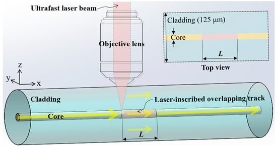 Ultrafast laser inscription (ULI) has been well established as one of the most efficient micromachining techniques, providing a powerful and flexible tool for the fabrication of three-dimensional photonic devices in dielectric materials []. Focused ultrashort laser pulses are known to provide the ability to locally modify the RI of the material through nonlinear energy transfer processes [,]. The pulse-induced permanent change in RI can either be positive or negative depending on the increase or decrease in RI of the interacting medium [,,,]. Positive index modification, which can be relatively easily realized with a low irradiation power, is common for the creation of optical waveguides in amorphous materials, e.g., in most glasses [,,]. The fabrication utilizing a negative regime is mainly used for a depressed cladding structure. ULI-fabricated depressed structures with customized cross-sections have been reported in glass and crystalline materials, such as Tm3+:ZBLAN glass [], Ho3+:ZBLAN glass [], phosphate glass [], Cr:ZnSe [], Cr:ZnS [], Tm3+:YAG [], Cr4+:YAG [], Nd3+:YAG [], LiNbO3 [,], and sapphire [,]. For the optical waveguide, its dimensions, number of propagation modes, amount of RI change, and NA can be altered by tailoring the interacting materials and exposure conditions. Hence, ULI can be regarded as a prime potential technique to modify the propagation and interaction of the modes in an optical fiber in a convenient manner.