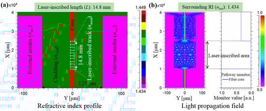 For the numerical calculation, a commercially available beam propagation method tool (RSoft BeamPROP) was adopted to model and assess the light propagation behavior. Figure 2a shows the structure of the proposed RI sensor and its index profile. The measurement setup which can be engaged for practical testing is depicted in Appendix C. A standard step-index SMF is considered for the embodiment of the sensor, for which the core and cladding are 8.2 μm and 125 μm in diameter, respectively, and the corresponding RIs are ncore = 1.449 and nclad = 1.444 at the wavelength of 1550 nm. The laser-induced track fully overlaps the core, playing the role of optically reshaping the core to form a “coreless fiber”. The length of the reshaped core that serves as the sensing region is L = 14.8 mm, which is approximately equal to the re-imaging distance. Based on the previous femtosecond laser-writing tests [,], it is presumed that the RI of the modified core is uniformly the same as that of the cladding (nmod = nclad), which corresponds to a negative RI change of −0.005. As indicated in Figure 2b, the fundamental fiber mode at the 1550 nm wavelength is launched into the SMF along the x-direction, and the pathway monitor is placed along the propagation direction. When light from the lead-in SMF arrives at the “coreless” territory, the light largely leaks out into the cladding in the presence of the fully reshaped core. For a given surrounding medium of nsur = 1.434, approximately 33.3% of the incident power recouples back to the SMF core and then remains constant after the sensing region, while the remaining light propagates as cladding modes and leaks out the fiber at the boundary between the surrounding media and lead-out SMF. As anticipated, the surrounding RI can therefore be determined by observing the output power from the fiber.