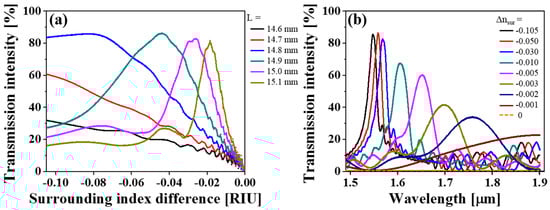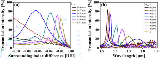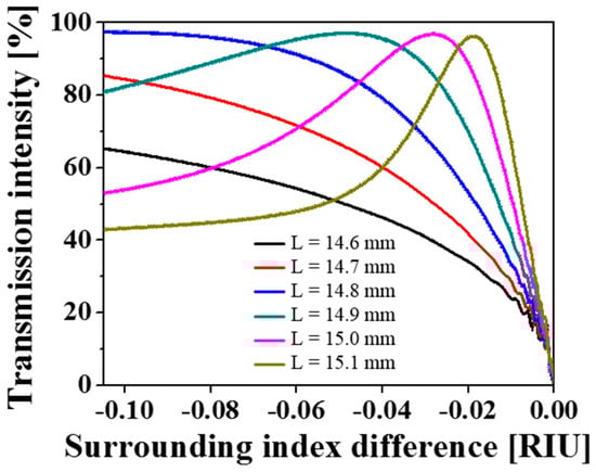 For the optical intensity-based interrogation, the calculated transmission for different interaction lengths is plotted in Figure 3. The relative change in the surrounding RI, defined as , is particularly used for the following demonstration. The transmission responses are obtained by launching the fundamental mode at a wavelength of 1550 nm as the input field. Δnsur ranges from −0.105 to 0 with a resolution of 0.001, as the RI of liquids is typically no less than 1.340. The optical intensity varies remarkably, hinging on the surrounding RI. In the cases of L = 14.6 mm, 14.7 mm, and 14.8 mm, the transmission intensity increases monotonously, as the surrounding index decreases from Δnsur = 0 to −0.105. However, for L > 14.8 mm, the non-monotonic peak intensities turn out to be caused by the MMI, which is governed by the propagation constant and the phase difference between each mode. Furthermore, the transmission intensity drops sharply to near zero owing to the mode leakage when Δnsur approaches zero. The slope of the transfer curves is more pronounced for sensors with longer interaction lengths, demonstrating higher sensitivity, while its monotonic range of measurable indices is narrower.