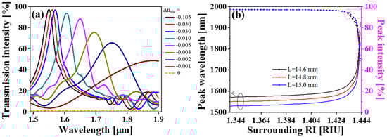 Meanwhile, with the intention of providing insight into the influence of the MMI, the transmission spectra were examined for incident wavelengths scanning from 1.5 μm to 1.9 μm for L = 14.8 mm. As depicted in Figure 4a, the transmission spectra were normalized with respect to the input light power. The transmission spectra at different surrounding RIs reveal that the interference peak shifts noticeably and monotonically toward longer wavelengths (red-shifts) as decreases, especially for , which is consistent with the prediction []. In this regime, high sensitivity and high resolution can be achieved concurrently. For instance, the wavelength shifts are 10.5 nm and 1.5 nm for the cases of Δnsur = −0.00100 ± 10−5 and −0.00300 ± 10−5, respectively. The peak intensity reaches an almost steady output when Δnsur < −0.030, providing a slow variation in transmission intensity as the light guided by the fiber rarely radiates. In contrast, the peak intensity is observed to decline dramatically when Δnsur approaches zero, by virtue of the enhanced evanescent field and resulting mode leakage. For the case of Δnsur = 0, a negligible transmission intensity can be recoupled back to the core of the SMF, and no interference peak is obtained. This might be attributed to the leakage of all the forward-propagating modes into the external surroundings. On top of the reduced optical intensity, the bandwidth of the transmission spectrum broadens with increasing surrounding RI to deteriorate the Q-factor. This is caused by the reduced number of excited modes according to Equation (2), resulting in weakened MMI resonance in the “coreless” fiber section [,].