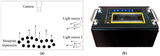 Illustration of the crime scene shoeprint scanner. (a) Structural diagram of the crime scene shoeprint scanner; (b) the real system of the crime scene shoeprint scanner.