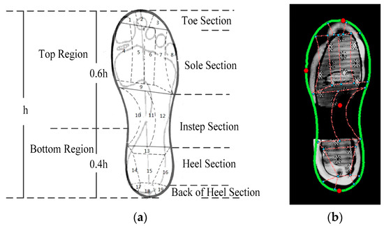 Figure 5. Illustration of the shoeprint partition model. (a) The layout of 19 subsections of a shoeprint; (b) Example of the Shoeprint Partition Model (SPM) for a full shoeprint.