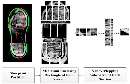 The partial layer features represent wear characteristics are used to determine whether two shoeprints have the same natural erosion caused by personal walking habits. Partial layer features are extracted in different subsections. The process of partial layer feature extraction are as follows, firstly the shoeprint is divided into nineteen subsections; secondly, the minimum enclosing rectangle region of each subsection is extracted and divided into non-overlapping patches; finally, the intensity distribution of each patch is used as the partial layer feature, which is represented as . Figure 6 shows the process of partial layer feature extraction.