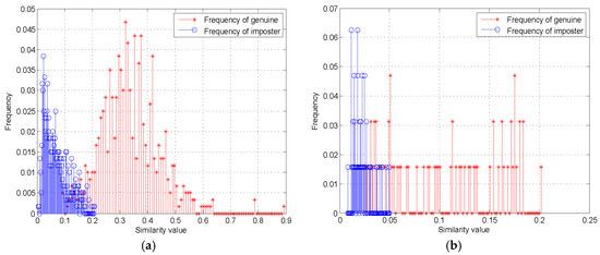 Genuine and imposter distributions of the proposed method on the datasets. (a) Results on the MUES-SV1KR2R dataset; (b) results on the MUES-SV2HS2S dataset.