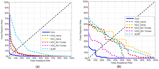 We also used the equal error rate to evaluate the performance of the methods on two datasets by making trade-offs between the false acceptance rate and the false rejection rate. The performance of the methods is shown in the Figure 11, where the equal error rates of the proposed method were 3.2% and 10.9% on the MUES-SV1KR2R and MUES-SV2HS2S, respectively.