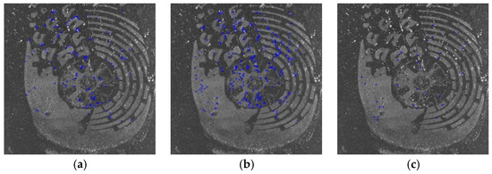 Figure 12 shows three samples of shoeprint in the MUES-SV2HS2S dataset. The shoeprints in Figure 12 have the same shoe pattern, and the shoeprint shown in Figure 12b is left by a different shoe from Figure 12a,c. The main individual identifying characteristics are labeled with red circles as shown in Figure 12a. Figure 13 and Figure 14 provide a visual illustration of the shoeprint verification results of the proposed method and the compared methods. We extract individual identifying characteristics on Figure 12a and compare these extracted characteristics at the same position in Figure 12b,c. The results between Figure 12a,b are shown in Figure 13, and the results between Figure 12a,c are shown in Figure 14. In Figure 13, the unmatched points are labeled with blue ‘*’ s. The unmatched points denote that the two shoeprints in the point location were different. The matched points are labeled with blue ‘*’s in Figure 14. The results show that our approach can tell not only the differences between two shoeprint images but also the characteristics in common. The results show that the proposed method outperformed the compared methods.
