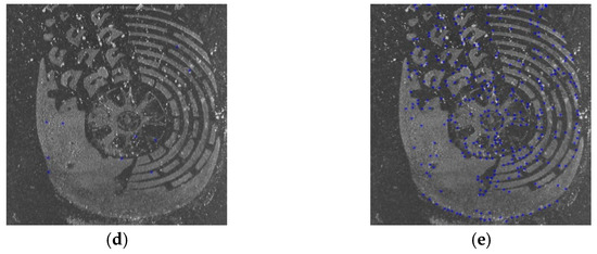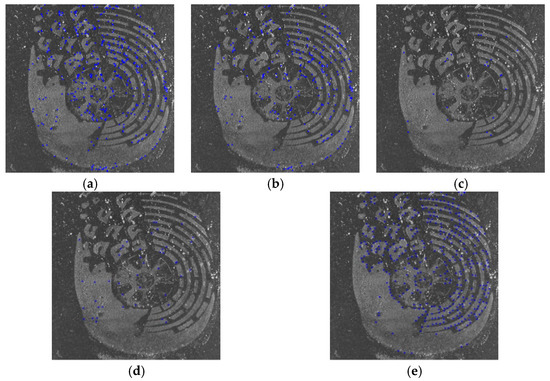 The results of the proposed and the compared methods on shoeprints made by the same shoe. The matched points are labeled with blue ‘*’s. The more points are labeled, which should include red circled points in Figure 12a at least, the better the algorithm performs. (a) The results of Harris_HOG; (b) the results of Harris_NCC; (c) the results of Shitomasi_NCC; (d) the results of Shitomasi_HOG; (e) the results of our method.