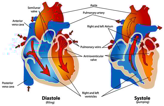 An illustration of the human heart can be seen in Figure 1. From a functional point of view, the heart consists of two separate pump systems: the left system which pumps the freshly oxygenated blood through the aorta into the systemic circulation of the body and the right system which pumps the blood from the superior and inferior vena cava into the pulmonary circulation through the pulmonary artery. Both systems consist of an atrium and a main chamber which is called ventricle. During each cardiac cycle, both ventricles of the heart contract simultaneously. The pumping effect is based on the rhythmic sequence of contraction (systole) and relaxation (diastole) of the heart. In the diastole, the ventricles are filled with blood. During the systole about 2/3 of the blood volume in the ventricles are ejected. The left half of the heart is usually much more muscular since it has to pump against a much higher pressure in the subsequent circulation [,].