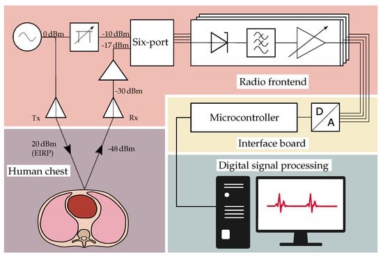 Without requiring any electrodes near the PUT, heart rate and respiration rate can also be measured using microwave radar systems, which are able to accurately detect relative or absolute distances. Displacements of the body surface caused by these vital signs can hence be measured and used for an estimation of the VP. Since clothes and bedding can be penetrated, a direct LOS is not required. Prototypes have been built at different frequencies and modulations, most of them between and . To process the data, frequency domain methods like the evaluation of the fast Fourier transform or correlations of the filtered pulse wave are commonly used []. However, recent advances in research have shown that heart sounds can be recorded with highly precise six-port based radar systems by filtering the distance signal in a band between 16 and 80 . Hence, these can be used to considerably increase the accuracy of contactless VP measurements [].