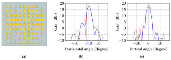 Antenna layout and radiation patterns of the series-fed patch array. (a) Antenna layout used for the field simulations; (b) Simulated (dashed) and measured (solid) radiation pattern in horizontal plane; (c) Simulated (dashed) and measured (solid) radiation pattern in vertical plane at inclination.