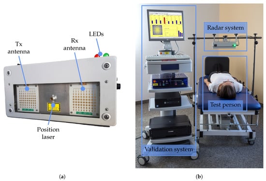 Photographs of prototype and validation systems. (a) Photograph of the radar system prototyp; (b) Photograph of the study setup.