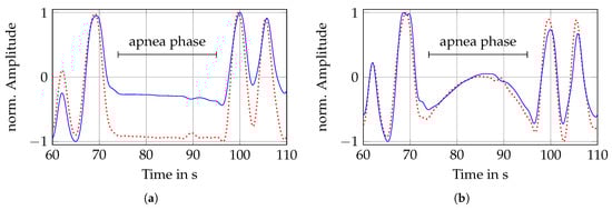 Whereas in Figure 8a a fourth order Butterworth lowpass filter is used, Figure 8b shows the result of using a fourth order Butterworth bandpass filter. If one compares the lowpass filtered breathing of the two sensors in Figure 8a, one can see that the apnea area is visible in both signals. The only difference between both filters is the intensity of the inspiration, because an error in unwrapping the phase occurred in the radar signal, which led to a constant offset error. The apnea phase in the bandpass filtered signals in Figure 8b can no longer be identified that easily, because constant components are filtered out. In addition, the offset error is not significant anymore.
