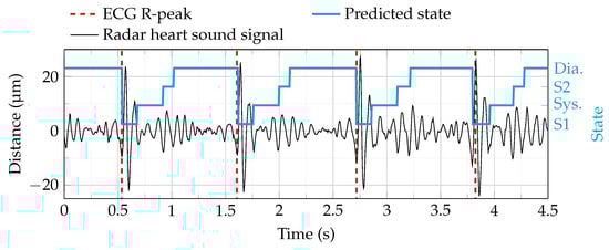 Segmentation of a radar heart sound signal using the hidden semi-Markov model (HSMM) algorithm []. The segmentation procedure predicts four states (blue line): First heart sound (S1), systole (Sys.), second heart sound (S2) and diastole (Dia.). The ECG R-peaks are plotted as a visual reference.