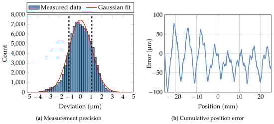 As a measure of the system performance, the achievable precision was measured. A linear stage with a movable metal plate was placed at a distance of 40 cm in front of the radar system. In order to mimic the reflection properties of the human body in the vital parameter sensing application, RF absorbers were stuck to the metal plate to reduce its radar cross section. After powering up the system until it was thermally stable, a linear movement of the stage which serves as reference for the ellipse reconstruction was performed. Subsequently, the stage was stopped and 100,000 samples were recorded, corresponding to a measure time of 50 s. As can be seen in Figure 10a, the samples approximately follow a Gaussian distribution with a standard deviation of 1.07 µm. Drifts of the mean value could not be observed during the measurement.