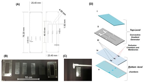 (A) Project of the two poly(dimethylsiloxane), PDMS, layers of the microfermentor; (B) layers and acrylic molds before the fermentor assembly; (C) microfermentor before the insertion and sealing of the optical fibers; (D) schematic diagram of the microfermentor: top-level (i) cover (glass), and (ii) microchannels (PDMS laminated); and bottom-level (iii) membranes (polycarbonate), (iv) intermediate sheet with holes (PDMS laminated), and (v) base (glass).