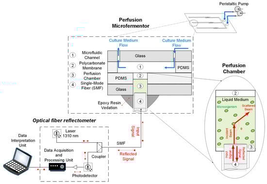 A comprehensive schematic of the instrumented microfermentor and the measurement system is shown in Figure 2. A peristaltic pump flows substrate through the microchannels of the PDMS top layer, and SMFs are inserted inside the perfusion chambers, evaluating the scattering of the laser light by the cells.