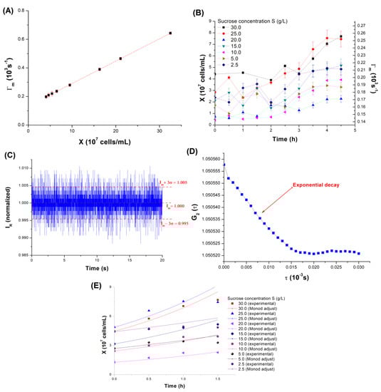 (A) Correlation between Γm and the concentration of cells; (B) concentrations experimentally obtained with the microfermentor for each concentration of sucrose in the microchannels, with the Γm values shown on the secondary axis; (C) normalized optical intensity IR corresponding to the highest verified Γm (30 g/L of sucrose, t = 4.5 h), and its interval Im ± 3σ; (D) autocorrelation function G2(τ) obtained from the signal of Figure 3C, showing the decay characteristic of the quasi-elastic light scattering (QELS); (E) comparison between experimental results of the microfermentor and the curves obtained with the Monod equation solved for the parameters calculated by the Visual Basic for Applications (VBA) algorithm (KM = 4.1 g/L and μm = 0.49 h−1).