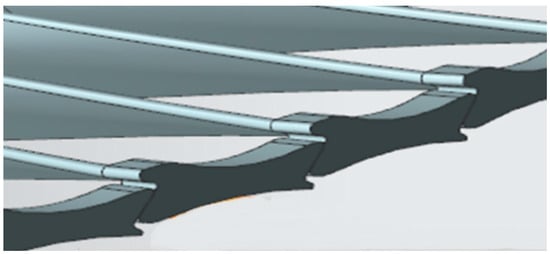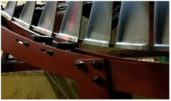 A rotor with shrouded blades in a steam turbine is a typical structure for a bladed disk. Shrouds are introduced to increase stiffness and also provide interblade coupling, as shown in Figure 1. Since a bladed disk is a cyclically periodic structure, it exhibits vibration modes where the mode shape has nodal diameters and the direction of vibration is axial. The bladed disk’s vibration mode can be extracted using nonlinear finite element analysis tools to evaluate the dynamic vibration performance [22,23]. It seemed that no vibration in the rotational direction was produced in the bladed disk, and certain modifications and improvements based on BTT techniques should be made for shrouded blades of a steam turbine.