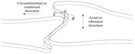Assuming the measuring spot (or the so-called sensing area) is among points B and C, the circumferential displacement would be produced when the blade vibrates in the axial direction. Then, the circumferential displacement of all blades could be obtained by the BTT method. The actual vibration deflection from point A to point C would lead the measuring point to change from point A to point B. The relationship between actual vibration amplitude (Aactual) and the amplitude result of BTT measurements (ABTT) is linear and described as follows: