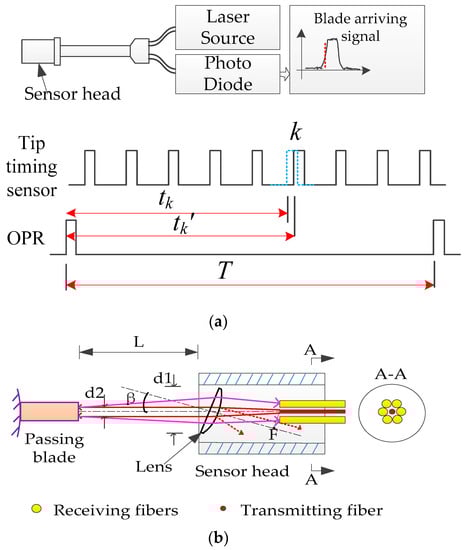 According to the above description, the measuring spot of a tip timing sensor should be small enough within a large range of working distance. The working distance range might change from 5 to 18 mm in different types of steam turbines. An innovative fiber optical sensor with a lens was proposed to satisfy all of the requirements of the tip timing sensor. The proposed fiber optical sensor with a lens was similar to a typical fiber optical tip timing sensor, which consists of a transmitting fiber in the center of the sensor head and six receiving fibers around, as shown in Figure 3a. The sensor head is mounted on the engine casing and transmits a beam of light from a laser source. A photo diode converts the reflected light into a voltage output when a blade passes through. The voltage is related to the intensity of reflected light, which would vary with the angle of the blade tip surface and the distance between the sensor head and blade tip. However, work of tip timing sensor is based sensing all the arrival times of “passing blades”, which are the occurrences of reflected light. It is not sensitive to the intensity of reflected light. A small intensity of reflected light would affect the SNR of the blade’s arrival signal, so the sensor is equipped with six receiving fibers. Figure 3a shows the basic principle of tip timing. Generally, the BTT system consists of four or more tip timing sensors, a once per revolution (OPR) sensor, signal conditioners, timing card, and BTT data analysis software. The blade arriving signal would be conditioned into pulses. The times of rising or falling edges are recorded by the timing card. If a blade was vibrating, the pulse would occur in an earlier or later time compared to the nonvibration stage. Then, data analysis software could obtain tip displacements in the circumferential direction and restore the vibration amplitude and frequency using a well-established model fitting method. Assuming the diameter of a rotating blade tip is D, the formula to calculate the displacement of blade k in Figure 3a could be described as: