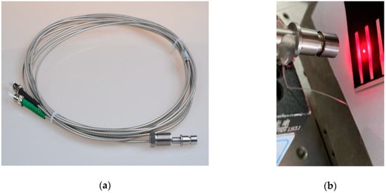 (a) Photograph of a fiber optical sensor with a lens. (b) Photograph of the measuring spot when the working distance is 19 mm.