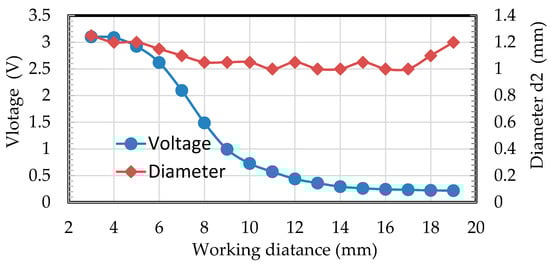Figure 5 shows that the beam of the transmitting fiber was collimated successfully. The diameter of the measuring spot was kept in the range from 1.0 to 1.25 mm. Although the voltage conversed from the reflecting light became smaller during a distance range from 8 to 19 mm (0.2 V in the distance of 19 mm), the noise of the voltage was under 0.01 V and the SNR was up to 20. The diameter of the measuring spot from the same fiber optical tip timing sensor without a lens was larger than 3.5 mm when the working distance was 15 mm. According to Equation (3), the relative measuring error of traditional optical sensors would be 19.533%.