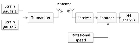 In the telemetry system, the transmitter modulated the strain signals and sent them to the receiver by antenna, shown in Figure 8. The recorder recorded the test data, and then the blade vibration response and vibration spectrum were processed using FFT analysis tools. Thus, vibration information including frequency and amplitude were all obtained.