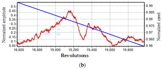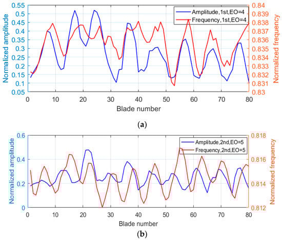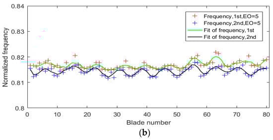 Figure 14 indicated that the normalized frequencies varied with blade numbers using a polynomial fitting. The number of periodic changes in the normalized frequencies of all blades was twice that of EO or ND. This could be explained by the degree of intershroud coupling or by the differences in stiffness between each other when synchronous vibration occurred. Generally, the frequency would be greater with the increase of intershroud coupling and stiffness, which are related to the vibration amplitude. Therefore, the number of periodic changes in normalized frequencies of all blades was also twice that of EO. Comparison results of normalized frequencies with normalized amplitudes are shown in Figure 15, which verified the above explanation. Figure 15a shows the comparison results in the first test when EO = 4, and Figure 15b shows the second test when EO = 5. The changes in frequencies were slightly slower than in amplitudes, indicating that the maximum changes of stiffness were not exactly located at the points of maximum amplitude.