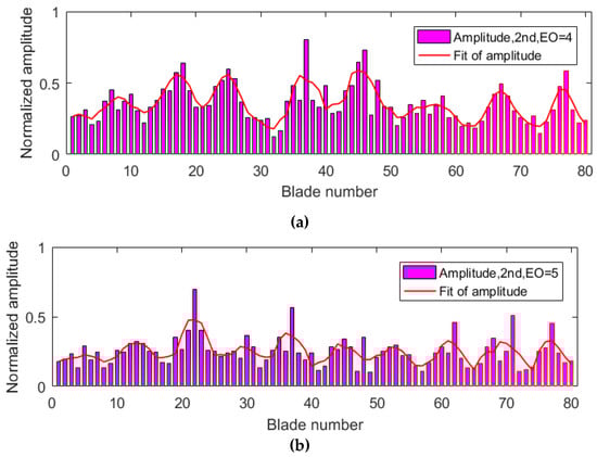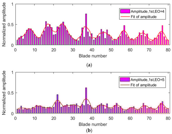 Normalized amplitudes of all blades in the second test: (a) EO = 4 and (b) EO = 5.
