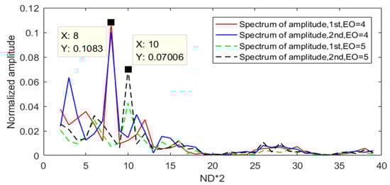 In order to obtain more details about ND in synchronous vibrations, a spectrum peak searching method was used, and the results are shown in Figure 12. Four spectrums of all blade amplitudes reached peaks at 2k Hz (k refers to ND).
