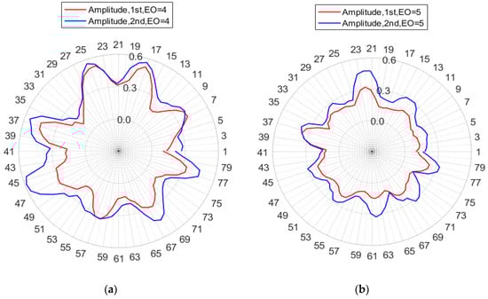 Polar plots of all blade amplitudes: (a) EO = 4 and (b) EO = 5.