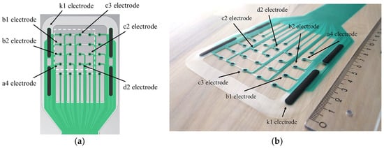 Figure 1. (a) The layout of the multielectrode sensor array prototype. (b) A photograph of the sensor array. The dashed white square marks the electrodes which participated in the measurements. The electrodes k1, a4, b1, b2, c2, c3, and d2 are marked on the figure. The electrodes a4, b1, and b2 were on the wound in the first experiment and the electrodes c2, c3, and d2 in the second experiment. The remaining electrodes in the array and on the left and the right side of the array were on the intact skin. The sensor array was based on the design presented by Kekonen et al. (2018) [24].