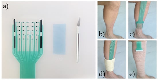 Figure 2. (a) The materials needed for preparing the multielectrode sensor array before placement on the skin. (b,c) The placement of the sensor array on the left shin. (d) A foam dressing applied on top of the sensor array. (e) Compression bandage folded on the shin; only the connector end was outside of the bandage.