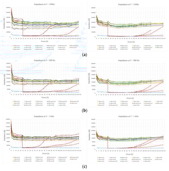 We also calculated the average skin impedance ( Z ¯ ) and the standard deviation (σ) for both experiments at 150 Hz, 300 Hz, 1 kHz, and 5 kHz frequencies just before and right after inducing the wounds on the skin underneath the three electrode pairs.