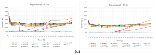 Figure 3. The impedance measurement results of the first experiment (left column) and the second experiment (right column) for 150 Hz, 300 Hz, 1 kHz, and 5 kHz frequencies. In both experiments, the impedance was measured from beneath the primary dressings for 142 h. A total of 17 electrode pairs were used in the measurements. In the first experiment, a wound was induced under the electrodes a4, b1, and b2 after 24 h of measuring skin impedance. In the second experiment, a wound was induced under the electrodes c2, c3, and d2 after 24 h of measuring skin impedance. The remaining 14 electrode pairs measured skin impedance over the 142 h follow-up period. The electrode pair k1–k2 consisted of electrodes which had a larger surface area. (a) 150 Hz; (b) 300 Hz; (c) 1 kHz; (d) 5 kHz.