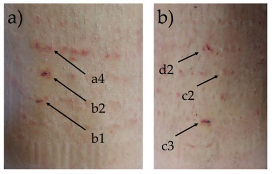 In the first experiment, the first signs of modest but conclusive impedance increase of electrode pair k1–a4 could be seen 2–4 h after inducing the wounds at 5 kHz frequency (Figure 3, left column). The time difference between the first signs of impedance increase at 150 Hz and 5 kHz frequencies was approximately 24 h. In all frequencies, the slope of the impedance magnitude gradually increased. The slope decreased when the wound impedance reached or exceeded the level of intact skin impedance. After 142 h of follow-up, the remaining leads cut off. The wound impedances at 5 kHz had surpassed the general level of the intact skin impedance. At 1 kHz frequency, the wound impedance measuring electrode pair k1–a4 had exceeded the average skin impedance, electrode pair k1–b2 had reached the average skin impedance, and electrode pair k1–b1 had not yet reached the average skin impedance. At 300 and 150 Hz, electrode pair k1–a4 had surpassed the average skin impedance, the electrode pair k1–b1 was closing the average skin impedance, and the electrode pair k1–b2 had not yet reached the average skin impedance. The wound dressings were removed after 142 h follow-up. By visual evaluation, it was noted that the wounds under electrodes a4 and b1 had re-epithelized, while the tissue under electrode b2 did not appear to be completely re-epithelized (Figure 4a). However, it is unclear if the wound had slightly reopened during removal of the dressings.