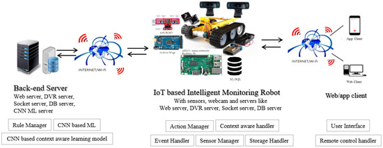 Figure 4 shows the architecture of IoT platform with an intelligent monitoring system that performs context-aware learning. An IoT platform with a context-awareness system should be able to distinguish between abnormal status and normal status from the monitored sensor value or images from a webcam by performing learning and real-time recognition processes on normal states to check for abnormal states. Also, it must have a variety of sensors that can measure indoor air conditions, such as room temperature and CO, and must be able to perform photo-taking functions to monitor the situation at a specific location. The sensors of the ultrasonic wave, the temperature, the light, the carbon monoxide, and the vibration will be used to detect the situation information of a predetermined area. It also should have a repository that stores the sensing values or images from a webcam while monitoring the environment. We constructed a web server, database server, socket server, and DVR server not only in the IoT-based monitoring robot but also in the backend server for backup and CNN-based context-aware learning.