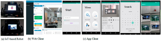 Graphical user interface of IoT platform with an intelligent monitoring robot. (a) IoT-based robot; (b) Web Client; (c) App Client.