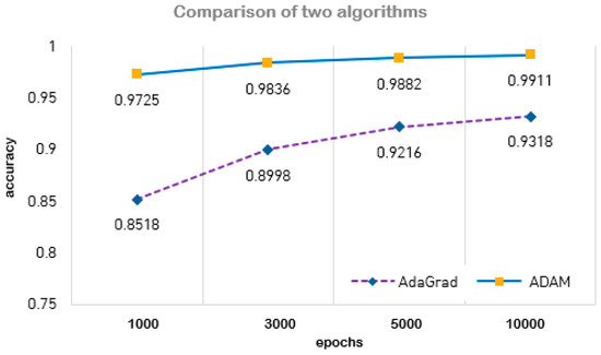 We tried to check accuracy according to epochs of 1000, 3000, 5000, and 10,000, and were able to verify the accuracy of both algorithms for each epoch. The accuracy rates of each algorithm are shown in Table 2 and Figure 12. In the case of ADAM, the accuracy was 0.9725 for 1000 epochs and 0.9911 for 10,000 epochs. Experimental results showed that 10,000 epochs using Adam optimization showed the highest performance. In experimental results of AdaGrad optimization, the accuracy was 0.8518 for 1000 epochs and 0.9318 for 10,000 epochs. As shown in Table 2, it was figured out that two algorithms had significantly different performance in learning accuracy.