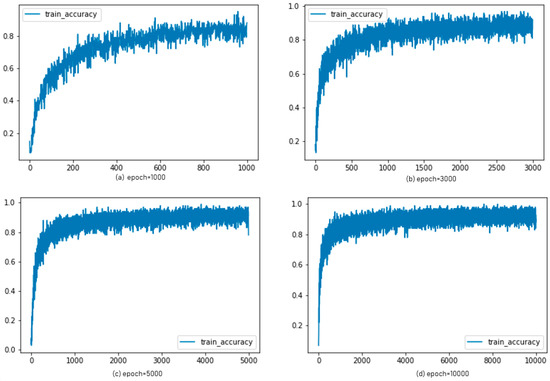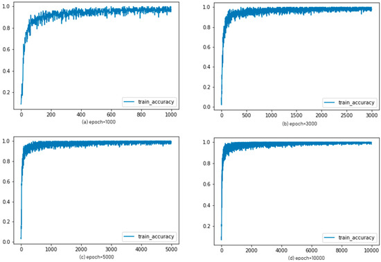 For the ADAM algorithm, the accuracy graphs were shown in Figure 13 with epochs of 1000, 3000, 5000, and 10,000, respectively. The graphs in Figure 14 showed the accuracy of AdaGrad according to each epoch.