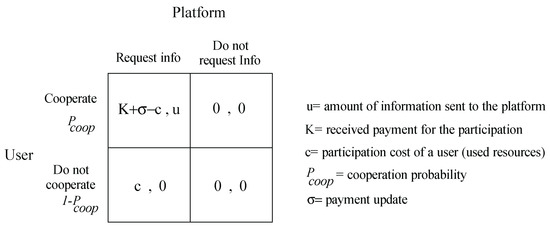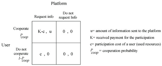 The main idea of this incentive model comes from the following analysis: it is possible to represent the system model by a Game Theory [35] perspective. The game will consider two players, the platform and the participant user. The set of actions or strategies will be cooperation or non-cooperation for the user and request information or not request it for the platform. The payment offered by the platform to carry out the collection of information will define the utility of the participant.