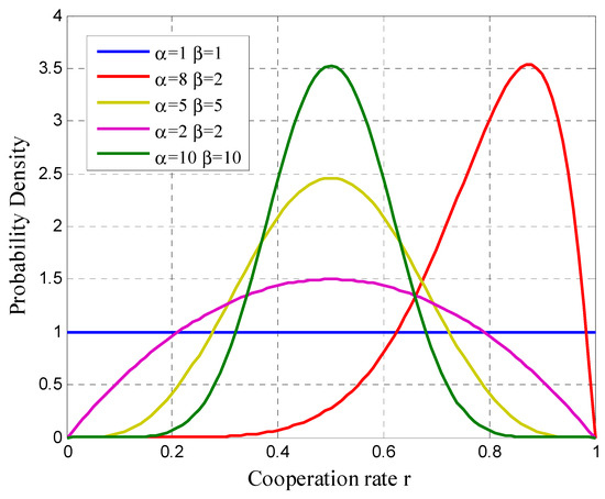 The variable in Equation (13) represents the response of user i to the different offered payments and we consider it as the cooperation rate or as the reputation of the user. There are reputation metrics created from a probability density function (PDF). When the analyzed events are binary in nature, the Beta PDF can be used to compute them [36,37]. The parameters of a PDF Beta can represent the behavior of the users.