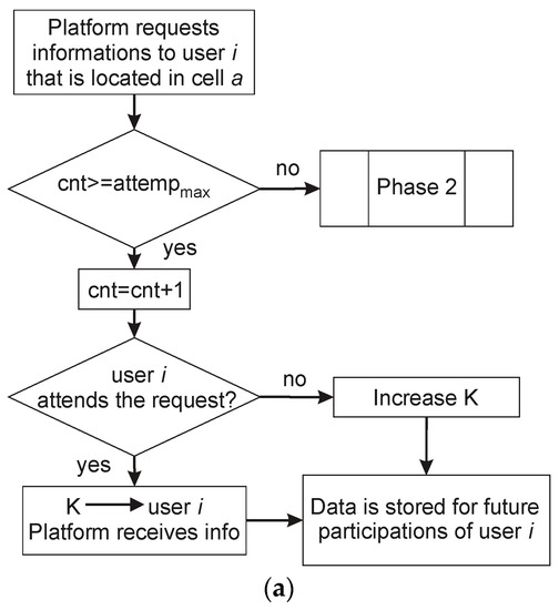 At certain instants of time, the platform requires information of an event of interest E in different physical locations, , of the analyzed area and offers an incentive or payment to motivate user participation. Participants receive the request and decide if they will perform the sensing. If they participate, they send the requested data to the platform and later receive their incentive.
