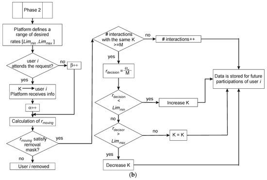 The platform defines a reference range of cooperation rate for each user i, , and if the cooperation rate is within this range, the platform considers the behavior of user i acceptable. Otherwise, when the cooperation rate is above the upper reference limit,, or below the lower reference limit,, the amount of the offered payment will be updated for the next attempt of participation. Equation (13) seeks the value to modify the payment K to achieve the satisfactory participation rate.