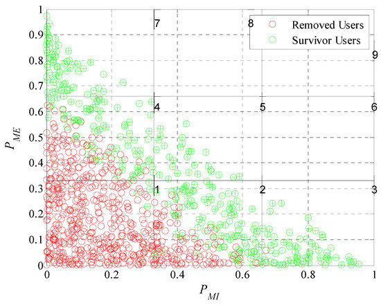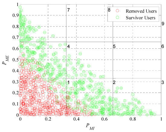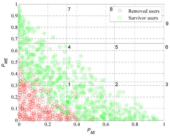 We now evaluate the participant and removed users in the subdivision by subclasses as performed in Figure 13. In Figure 19, Figure 20, Figure 21 and Figure 22 we present the analysis for and . Noting that we show the case for in Figure 13. With this set of Figures, we aim to reinforce the conclusion obtained through Figure 18. The higher the value of the greater the number of removed users. We can observe that users that the model considers in a scenario of lower will be removed when the scenario has higher requirements. The characteristics of the survivor users (green dots) moves further away from the origin when is higher, converging on the diagonal of the plane. As in Figure 13, we can verify for the different values of that the incentive model determines and chooses correctly the users that best adapt to the initial requirements of the platform. We also prove that in a population with different types of users is complex to see many users who meet strict requirements.